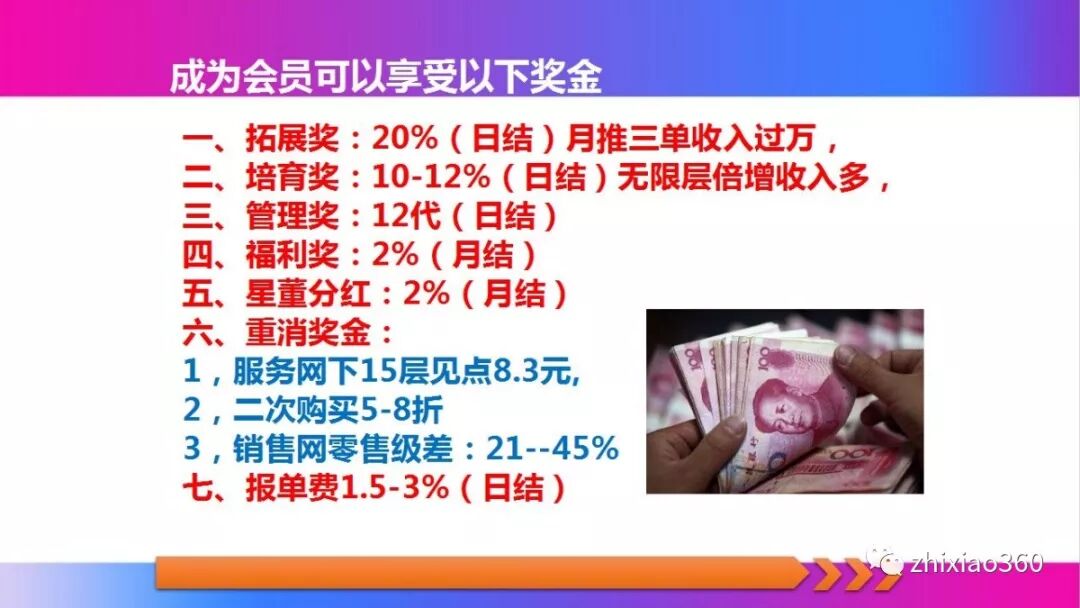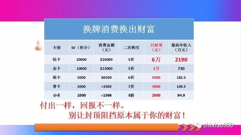 第一是拓展奖也就是直推奖,只要你推荐一个钻卡(20000)可以直接拿20%的提成也就是20000X20%=4000,直接推荐3个钻卡的收益就是4000X3=12000,也就是月推三单过万;