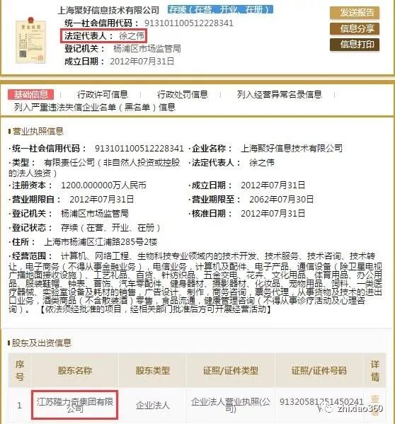 在全国企业信用信息公示系统中可查出上海聚好信息技术有限公司也就是隆力奇经销商所持有的《股权证书》主体企业,再者上海聚好信息技术有限公司注册时间为2012年7月31日,注册资本为1200万元,由“江苏隆力奇集团有限公司”出资100%注册成立,法人就是隆力奇公司主体法人。
