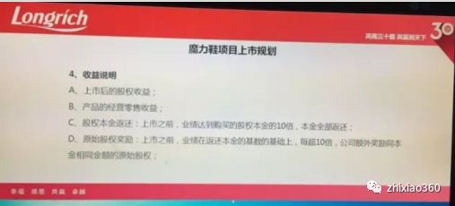 可以从经销商他们宣称的上市信息中得出:一、此次认购原始股只针对艾力沛魔力鞋的代理商,也就是故意提高门槛吸引诱惑更多的新人加盟代理魔力鞋,以此来提升业绩,也避免其他不必要的麻烦;二、公司预计最晚在2020年上市,在没有上市之前公司承诺经销商每年给股本8%的静态返利,如果经销商想要收回投资公司给予退返。隆力奇宣称上市,就是利用“原始股”为噱头激励制度,诱惑经销商大额投资,不断的吸引经销商以及新人加盟。