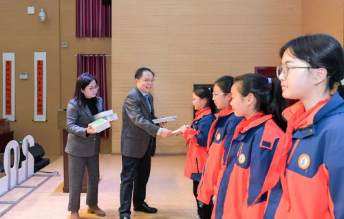 捐赠仪式上,该校的学生代表从赠书嘉宾的手中接过捐赠图书的同时,还亲手为赠书嘉宾戴上了红领巾,用特殊的方式表达感谢。