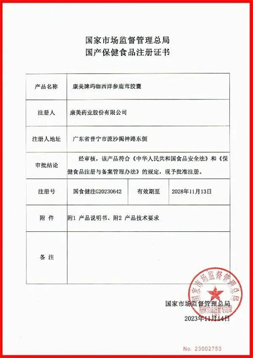 康美牌玛咖西洋参鹿茸胶囊获国家市场监督管理总局国产保健食品注册证书