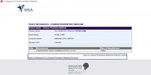 图为在新加坡卫生科学局(HSA)网站查询到的芪苈强心胶囊注册信息。