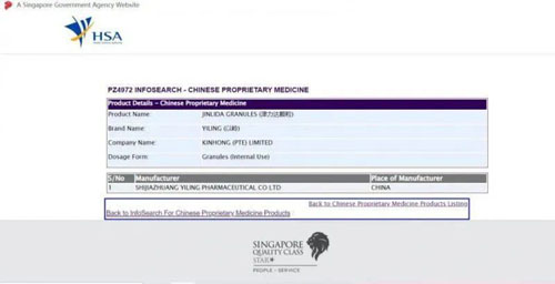 图为在新加坡卫生科学局(HSA)网站查询到的津力达颗粒注册信息。