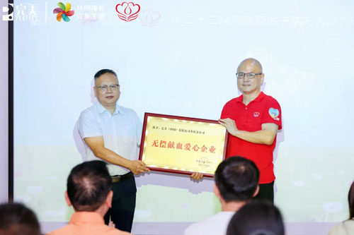为了表彰多年来完美重庆分公司积极参与无偿献血公益事业,重庆市血液中心带来一份特别的鼓励,团队献血服务总管邓东郑重地将一块象征荣誉与责任的“无偿献血爱心企业”牌匾授予完美重庆分公司,表彰其在无偿献血事业中做出的卓越贡献。
