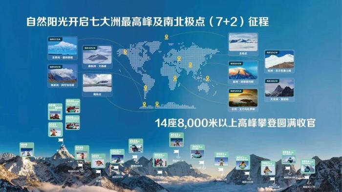 本着不断超越、不断设立更高目标(set the bar higher)的企业精神,自然阳光并未止步于14座8000米雪峰的辉煌成就。2025年初,品牌正式宣布启动更具雄心的“自然阳光七大洲及两极高峰攀登计划”(以下简称“7+2”),旨在挑战全球七大洲最高峰并抵达地球南北两极极点。这标志着品牌的全球视野与探索疆域,正从亚洲屋脊向更广阔的世界版图拓展。