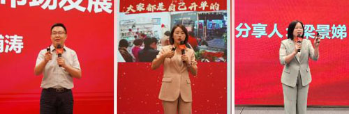 星级健康管理服务中心负责人浦涛分享了如何借助会议凝聚团队力量,推动事业持续发展;星级健康管理服务中心负责人张飞分享了借助松延膏开拓高端客户群体的经验,以及如何紧跟公司政策培养健康顾问、裂变社区站;星级健康管理服务中心负责人梁景娣则分享了稳步鞋的热销状况,以及如何借力电商活动实现引流拓新。