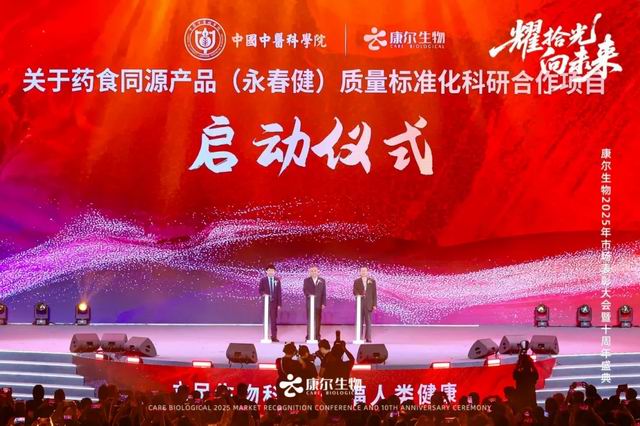 当“标准化”成为抗衰产业的核心趋势,康尔生物联手中国中医科学院共同启动关于“药食同源产品(永春健)质量标准化科研合作项目”更具行业里程碑意义。中国中医科学院首席研究员、中药复方新药国家工程研究中心常务副主任叶祖光先生,康尔生物董事长邹圣灿先生,原国家质检总局副局长葛志荣先生在康尔生物十周年盛典上共同见证了项目的启动,这不仅象征着康尔生物对药食同源传统智慧的科学化探索迈入新阶段,更意味着中国抗衰老产品将迎来“标准化、规范化、国际化”的全新发展格局。