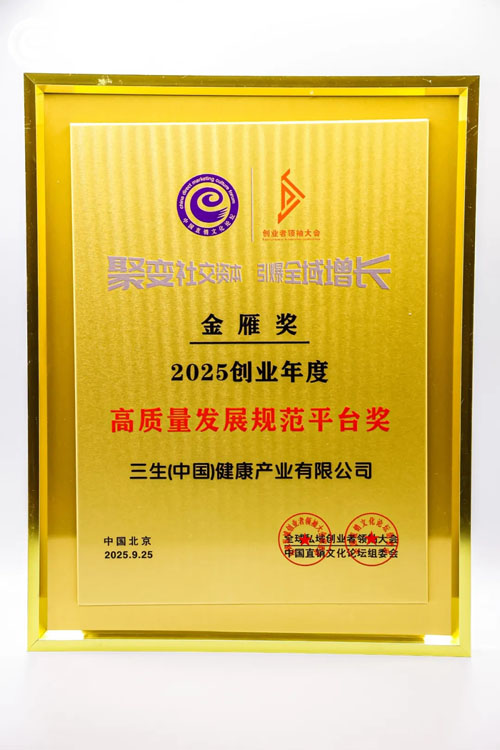 在备受瞩目的颁奖典礼上,三生(中国)凭借卓越的企业治理、稳健的市场表现与持续的品牌影响力,一举斩获三项重磅大奖——“2025创业年度高质量发展规范平台奖”、“2025尊敬中国受人尊敬直销企业奖”、“2025创业中国稳健企业奖”,成为本届大会最受瞩目的企业之一,充分彰显了其在中国大健康产业与社交商业领域的标杆地位。