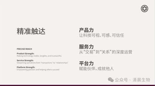 清晨通过构建“产品-服务-平台”的闭环飞轮,实现可持续的精准触达。在产品层面,让科技可视、可感、可信任,如:将表皮干细胞定向分化技术应用于高端护肤品牌,突破活性成分透皮吸收瓶颈;在服务层面,从“交易”到“关系”的深度运营,通过数字化工具构建电子健康档案,提供24小时在线健康管理服务,打造有温度的健康社群,通过“主动式、管家式”的服务,极大地提升用户的粘性与生命周期价值;在平台层面,赋能伙伴,成就他人,为经销商打造“轻创业、重赋能”的服务型平台,实现从学习、分享到订单管理的全流程支持,让经销商更专业、更自信、更轻松地服务客户,从而实现个人价值与市场拓展的双赢。