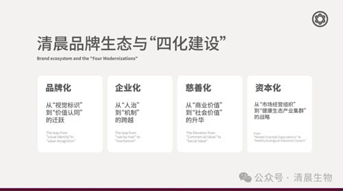清晨通过“品牌化、企业化、慈善化、资本化”的四化建设,品牌化实现从“视觉标识”到“价值认同”的跃迁;企业化构建从“人治”到“机制”的现代化治理体系;慈善化为事业注入温暖底色,实现从“商业价值”到“社会价值”的升华;资本化以战略视野布局未来产业生态。最终实现企业从“市场经营组织”到“健康生态产业集群”的战略升维。