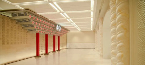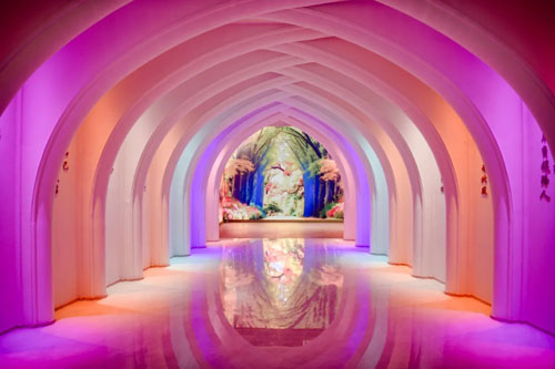 “瑞彩新章尾厅”则勾勒出一幅天人合一、个体与时代共鸣的理想图景,瑞彩拱廊和“桃花源”景墙,象征着从个体觉醒到万物圆融的境界升华。
