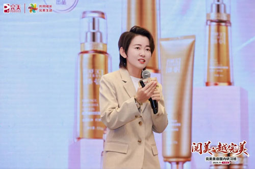 完美公司美容养肤委员会委员、高级客户总监赵娜娜在《美丽绽放,光谱同行》主题分享中,详细介绍了美丽事业抓手,并分解了邮轮研习班的目标与规划,激励大家向着更高目标迈进。
