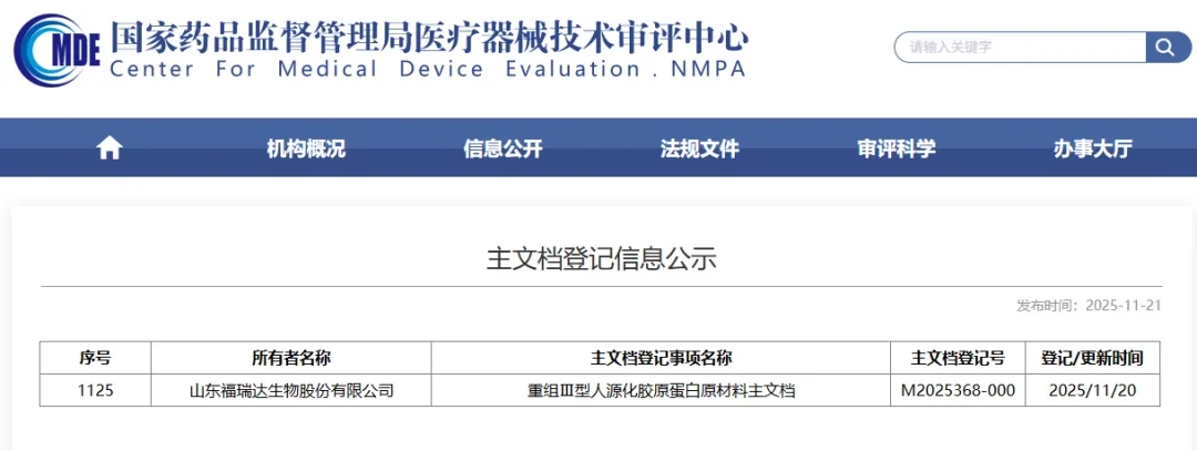 近日,国家药品监督管理局医疗器械技术审评中心官网公示,福瑞达生物股份研发的植入级别的重组Ⅲ型人源化胶原蛋原材料成功完成主文档登记(主文档登记号:M2025368-000)。这一突破性成果不仅标志着福瑞达生物股份在高端医疗器械原材料领域实现关键进阶,更成为其“生活美容+医学美容”双美产业生态建设的核心支点,为双美业态的高端化、一体化布局打通了从核心原料到终端场景的关键准入通道。