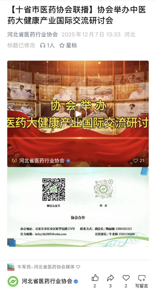 2025年12月6日,由河北省医药行业协会主办,金木集团、保定中药等单位联合承办的“东方本草・健康共享——中医药大健康产业国际交流研讨会”在“千年药都”河北安国隆重召开。