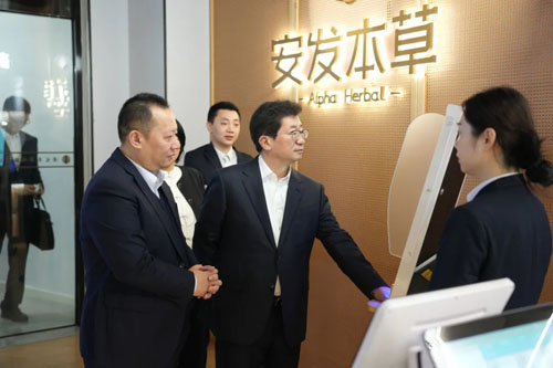 随后,调研组移步至安发本草体验馆。在AI体质自检区,吕家进董事长一行亲身体验AI面诊仪的快速检测流程,品鉴了根据体质定制的健康茶饮,切身感受“药食同源”的东方智慧。