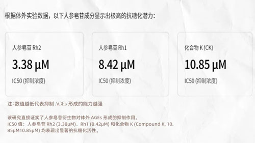 4.加速AGEs代谢:稀有皂苷 Rh2、Rg3 能提升皮肤细胞代谢效率,减少 AGEs 在真皮层的堆积;其中部分人参皂苷(如 Rb1)可抑制酪氨酸酶活性,改善糖化导致的肤色暗沉。[7]