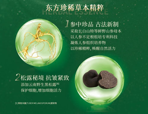 1.高活性核心配方:以人参组培养物为核心,复配云南野生黑松露精华,双重活性成分协同作用,精准靶向AGEs堆积区域,从根源激活细胞修复机制。