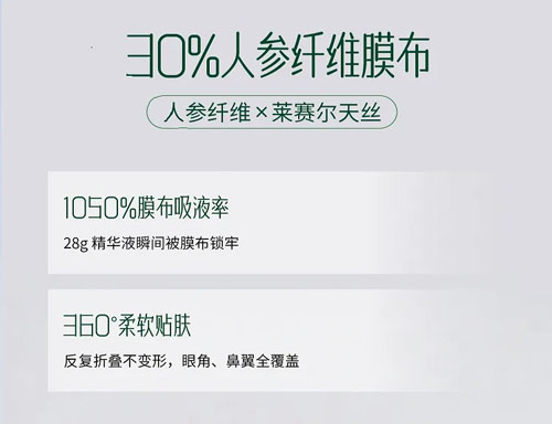 3.创新人参纤维膜布:系列面膜采用30%人参纤维制成,吸液率高达1050%,能承载高浓度干细胞精华,敷贴时同步释放辅助活性成分,强化保湿与修复效果。