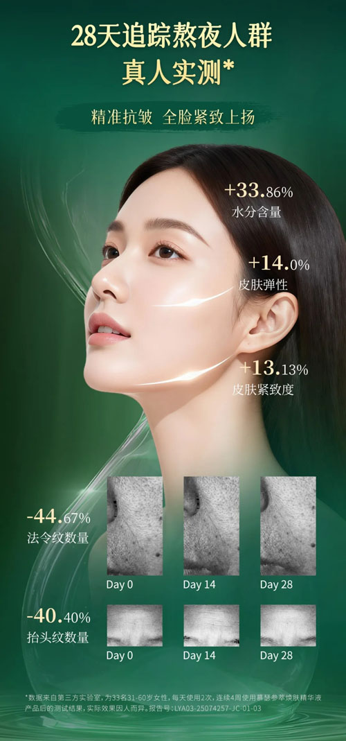 8、“数据来自第三方实验室,为33名31-60岁女性,每天使用2次,连续4周使用慕瑟参萃焕肤精华液。产品后的测试结果,实际效果因人而异。报告号:LYA03-25074257-JC-01-03