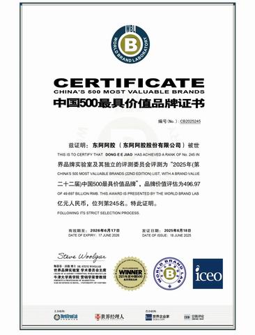 文化驱动产业,让产业拥有灵魂。东阿阿胶将深厚的文化资源系统转化为坚实的产品力与卓越的品牌力。以典籍智慧为源泉,多元化推进产品创新——从传统阿胶块到即食化、时尚化的阿胶糕、阿胶粉、阿胶酸奶、阿胶燕窝,每一次产品形态的创新,都是对阿胶千年养生智慧的当代诠释与价值延伸。以文化传播为主线,扎实推进品牌建设,已逐步构建起以“东阿阿胶”为核心品牌,“复方阿胶浆”“桃花姬”为两翼,“皇家围场1619”“壮本”等为延伸的“一超多强”品牌矩阵。这一体系的建设成效卓著,备受认可:企业不仅被评为全国“品牌故事孵化基地”,还十一度蝉联西普会“健康产业品牌价值榜”榜首,并16次入选《中国500最具价值品牌》榜单,最新品牌价值已达496.97亿元。