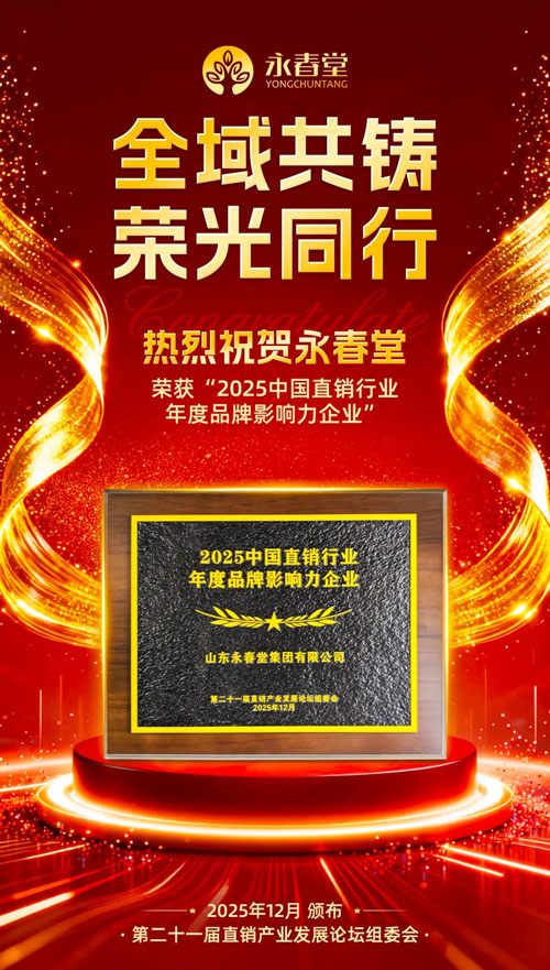 这份沉甸甸的荣誉由第二十一届直销产业发展论坛组委会于 2025 年 12 月正式授予 —— 作为直销领域极具分量的年度权威奖项,它是行业对永春堂在品牌建设、市场口碑、产业正向贡献等维度的集中肯定。