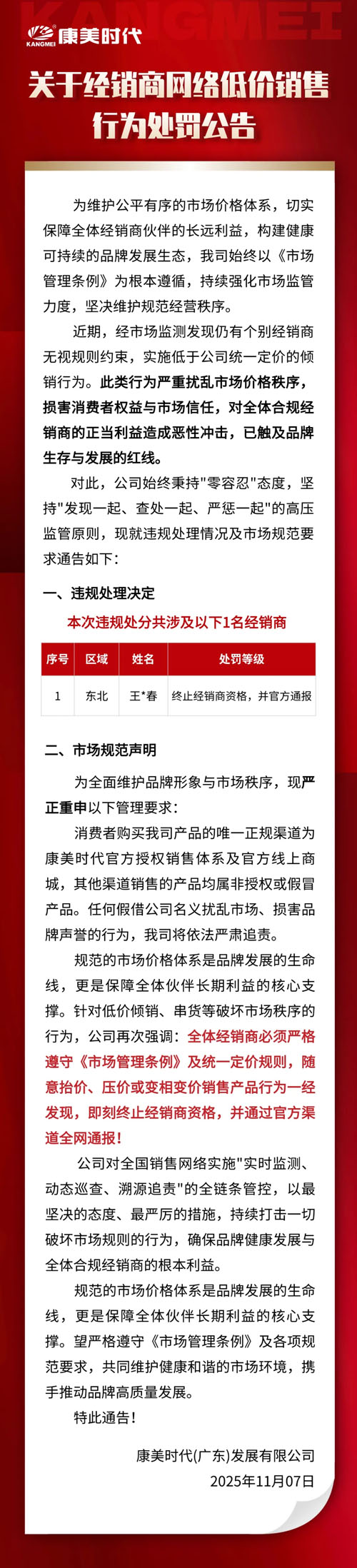 经销商网络低价销售 康美时代发布处罚公告