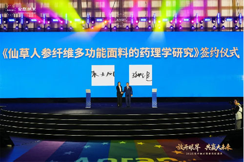 技术创新的落地离不开科研力量的支撑。盛典现场,青岛大学纺织服装学院副教授、硕士生导师、纺织工程系主任朱士凤女士与张明臣先生共同签署《仙草人参纤维多功能面料的药理学研究》项目。