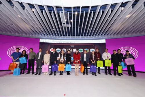 联合国全球孝道委员会共同主席、国际经济战略研究院院长、中国健康扶贫工程理事会名誉会长、中华青年联合会常委彭丹女士上台抽奖并颁奖合影