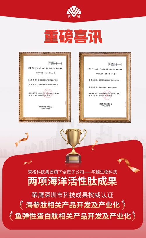 近日,荣格科技集团旗下全资子公司——华臻生物科技(深圳)有限公司,在海洋活性肽产业化领域实现两项重大突破!