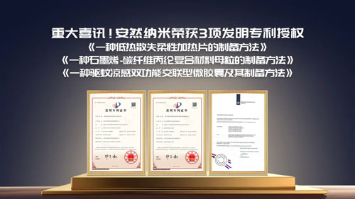 其中,《一种低热散失柔性加热片的制备方法》与《一种石墨烯-碳纤维丙纶复合材料母粒的制备方法》获国家知识产权局授权,《一种驱蚊凉感双功能交联型微胶囊及其制备方法》获荷兰发明专利授权,标志着安然在功能材料与健康纺织领域的技术实力再次获得国际国内双重肯定。