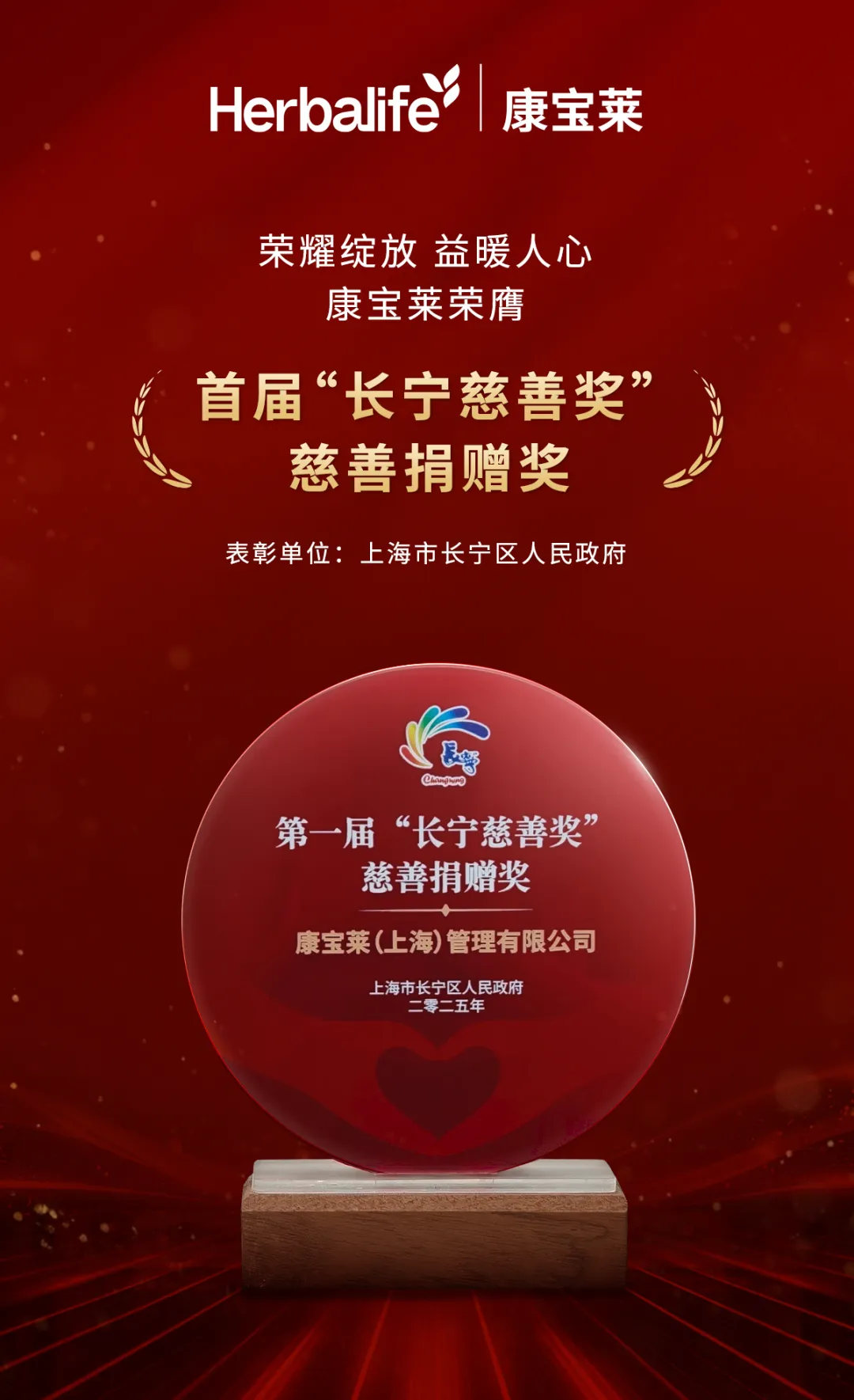在马克·休斯纪念日即将到来之际,康宝莱以“用来自心底的爱对待和影响他人”的传承与坚守,收获温暖回响,荣获上海市长宁区人民政府颁发的首届“长宁慈善奖”慈善捐赠奖!