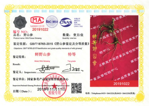 天萃百龄™野山参获国家参茸产品质量检验检测中心特等野山参认证
