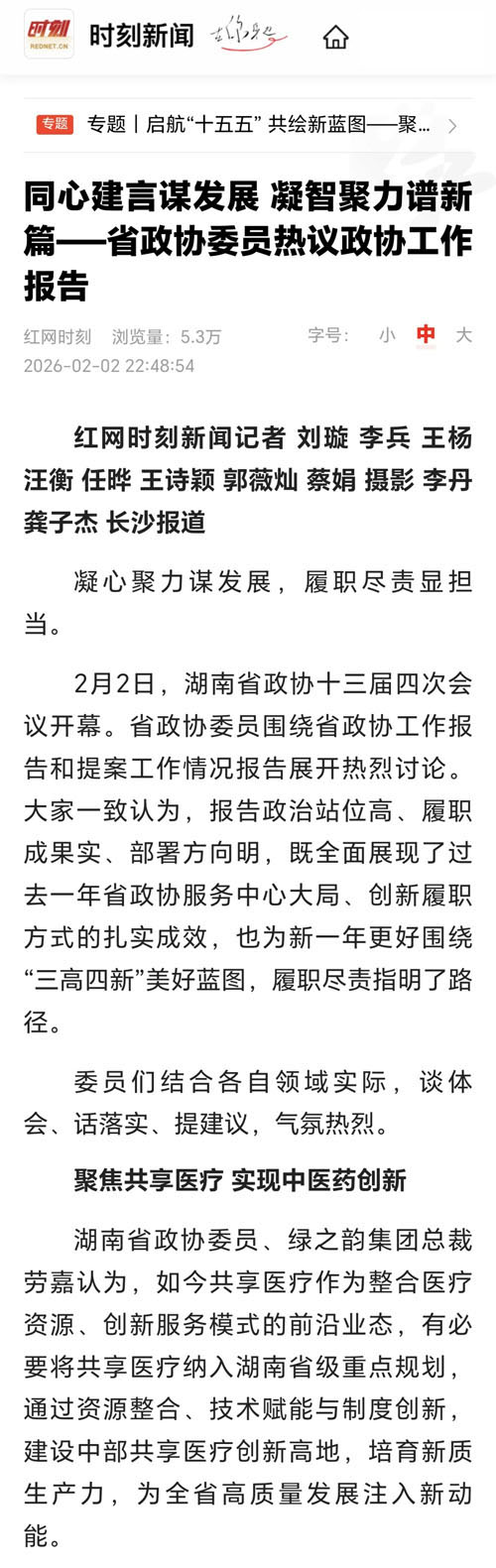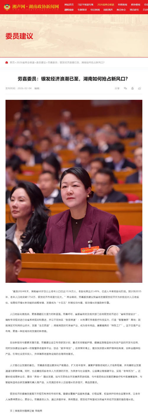 2月3日上午,劳嘉委员列席湖南省十四届人大四次会议,认真听取《省政府工作报告》,并在分组讨论中结合履职实际积极建言献策。作为省政协委员,她心系民生,紧扣人口结构变化与健康服务升级趋势,聚焦 “银发经济” 与 “共享医疗” 两大方向带来提案。本次两会,她提交《关于将共享医疗全面融入 “十五五” 规划 打造中部共享医疗创新高地的建议》,建议将共享医疗纳入省级 “十五五” 专项规划,在长株潭建共享医疗综合体、设省级智慧医疗实验室,并构建多部门联动的一站式监管体系。同时,她在大会书面发言中提出《关于发展银发经济、培育 “十五五” 新增长极》的建议,主张将银发经济列为省级战略性支柱产业,按区域特色布局康养产业,搭建全省智慧养老服务平台,推进长期护理保险全覆盖,开发银发人力资源。两项建言紧扣时代脉搏、兼具战略高度与落地路径,获《湘声报》、中国新闻网、红网、《长沙晚报》、《潇湘晨报》等主流媒体广泛关注和深度报道。