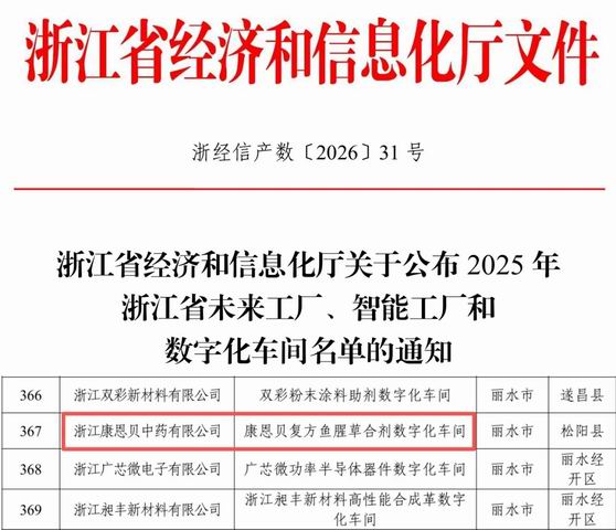 近日,浙江省经信厅正式公布了2025年浙江省未来工厂、智能工厂和数字化车间名单,康恩贝中药凭借“复方鱼腥草合剂数字化车间”项目成功入选“数字化车间”名单。