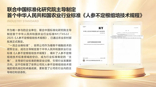 公司已获评国家级专精特新“小巨人”企业、国家高新技术企业、国家知识产权优势企业等多项荣誉;拥有纳米材料制备与应用、植物干细胞技术上百项专利,其中植物干细胞技术斩获近 40 项国家发明专利;联合中国标准化研究院主导制定首个农业行业标准《人参不定根组培技术规程》,填补了人参不定根组培技术标准领域的空白。