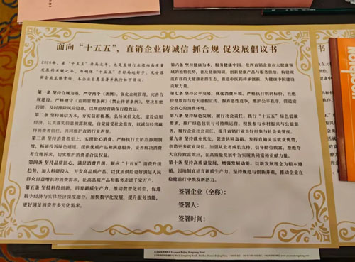 会议期间,九极公司与所有与会直销企业代表共同签署了《面向“十五五”:直销企业铸诚信 抓合规 促发展倡议书》,承诺将严格遵守法律法规,加强行业自律,共同维护直销市场的健康秩序。