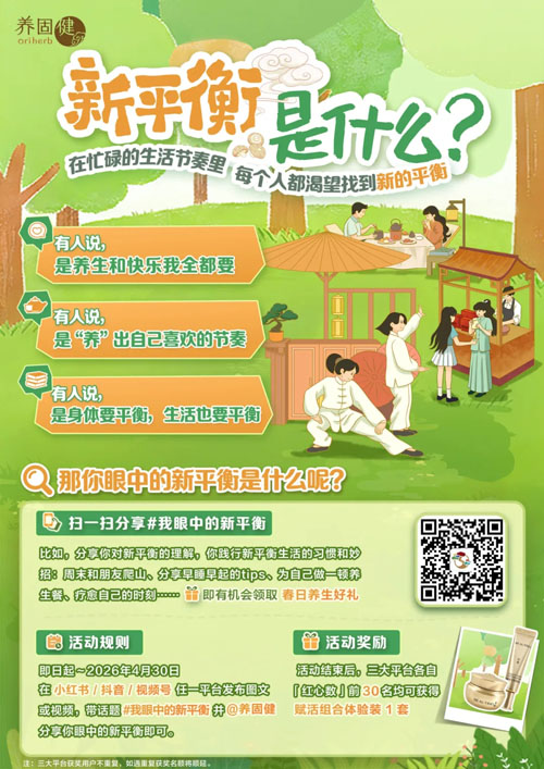 养固健提出“新平衡主义”的倡议,希望帮助更多人调养身体状态,达致身体平衡,调优⽣活方式,达致生活平衡。今年,养固健将作为同行者,倾听你、记录你的新平衡故事,共同探求平衡的答案。