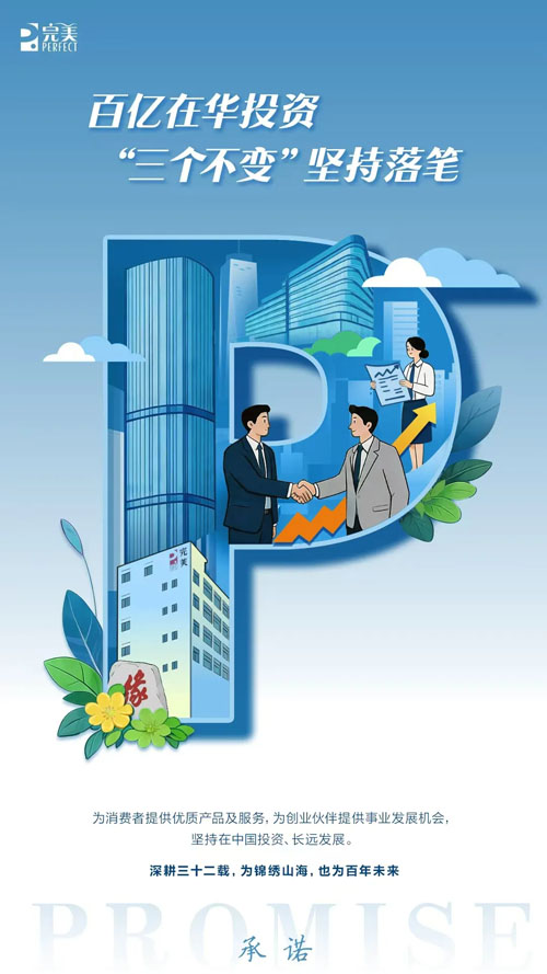 正因如此,完美从成立之初便提出“三个不变”:为消费者提供优质产品及服务的理念不变;为创业伙伴提供事业发展机会的理念不变;坚持在中国投资、长远发展的理念不变。这三句“不变”,化作32年的坚持“落笔”。