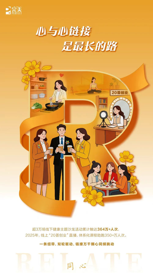 基于这一理念,完美跳出“流量转化”的传统商业逻辑,用超3万场线下健康主题沙龙触达364多万用户。这些沙龙让消费者亲自体验、提问、分享。线上“20荟创业”直播与体系化课程,2025年累计赋能超过350万人次,为普通人搭建起低门槛的成长平台。
