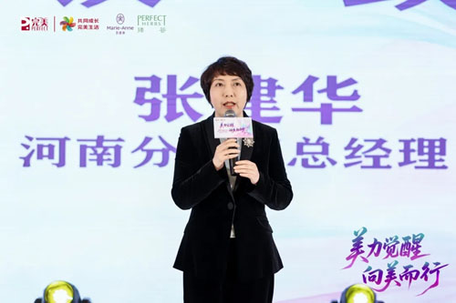 完美河南分公司总经理张建华作会议致辞。她深情回顾了玛丽艳品牌在河南的深耕历程,对创业伙伴们过去一年的拼搏与成绩给予高度肯定,并围绕“美力觉醒”的核心精神,号召大家以精准需求、功效落地、情绪价值为推广核心,争做专业赋能者、美丽实践者、生活创造者,精耕河南美容市场,携手共赴美好未来。