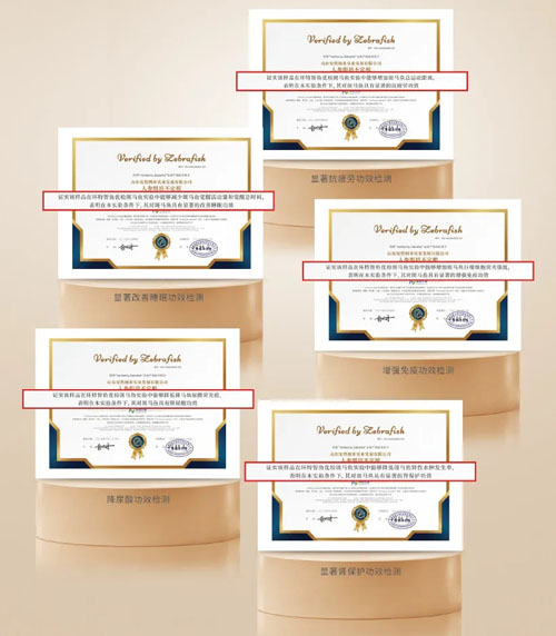 *以上结论源自杭州环特生物科技股份有限公司出具的人参组培不定根针对斑马鱼的功效证书,证书编号分别为VBZ-HB/20250604004,VBZ-HB/20250604003,VBZ-HB/20250604002,VBZ-HB/20250604005,VBZ-HB/20250626004(仅针对送检样品)