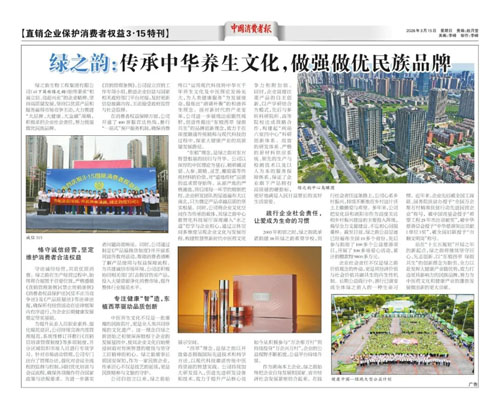 在推动高质量发展、满足人民美好生活需要的新征程上,守护消费安全、优化消费环境是企业与社会的共同责任。2026年3月15日,《中国消费者报》以《绿之韵:传承中华养生文化,做强做优民族品牌》为题,从“恪守诚信经营,坚定维护消费者合法权益”“专注健康‘智’造,东植西萃驱动品质创新”“践行企业社会责任,让爱成为生命的习惯”等多个维度,全面展现了绿之韵在新时代背景下,秉承“和诚立信、竞超兴业”精神,以“东植西萃 绿韵共生”理念驱动品质升级,积极履行社会责任,致力于做强做优民族品牌的担当与作为。