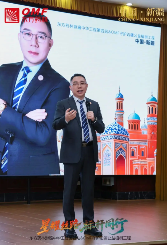 随后,东方药林董事长何涛先生以《爱心满丝路 情定麦盖提》为题发表公益主题演讲,深情阐述了发起此次行动的初心与愿景。他提出了东方药林人追求的“三重价值”: