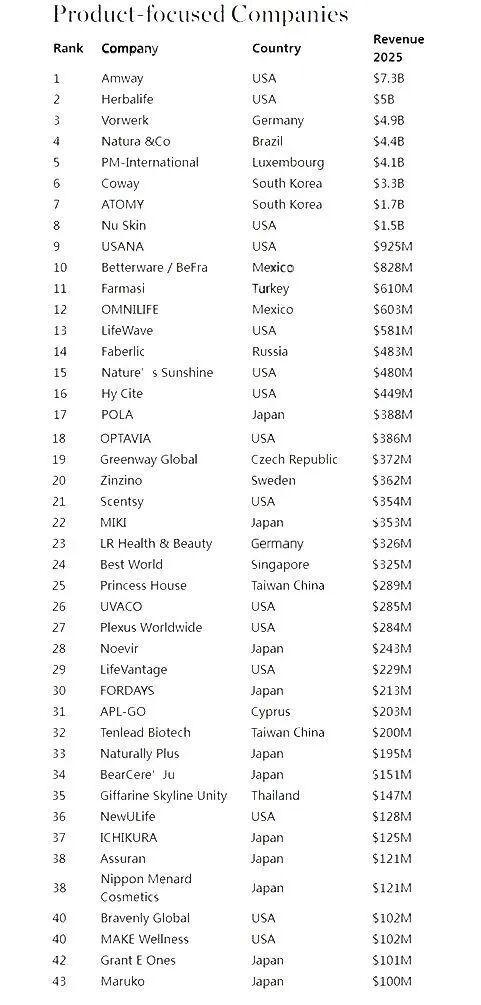 近日,DSN发布了2026全球直销企业100强榜。该名单表彰了43家产品型直销企业和16家服务型直销企业。具体名单如下: